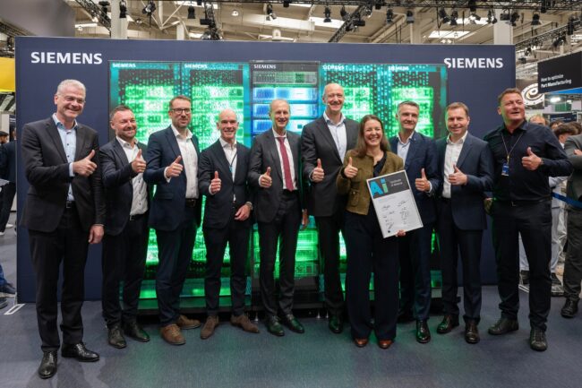 EMO 2025, Siemens Data license agreement at Siemens, Germany, Hall 6, F30, persons from left to right: Prof. Christian Brecher, Chair of Machine Tools RWTH/WZL; Dieter Lindemayer, VP Division Innovation & Technology, Voith; William Lee, CEO Renishaw; Achim Beltz, CEO Business Unit Motion Control, Siemens AG; German Wankmilller, CEO Grob; Roland Busch, Chief Executive Officer Siemens; Stefanie Frank Head of technology Siemens; Dr. Ing. Stephan Mayer, CEO Machine Tools Trumpf; Dr. Claus Eppler, CTO Chiron Group; Dr. Thorsten Schmidt, CEO Heller