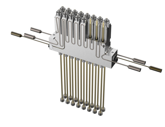 GÜNTHER ClusterFlow nozzle isometric view with needles and a cross-section. © GÜNTHER Hot Runner Technology